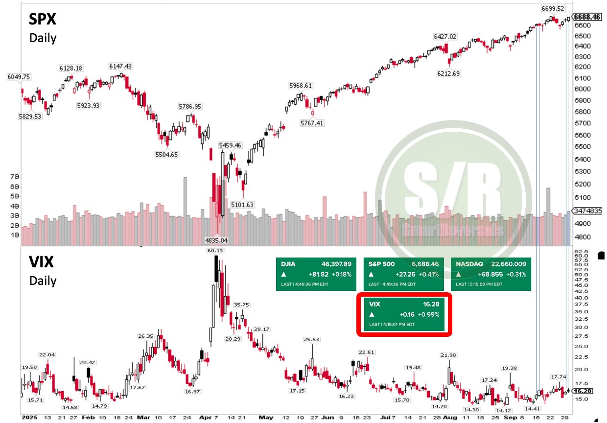 | blomblom @someone44 2025-10-01 Post: interesting picture that shows the general stock market, as is indicated by the s&p 500, usually trades the exact opposite of the vix. however, right now, the vix and spx and running together. last time this happened, the spx blinked first | | |