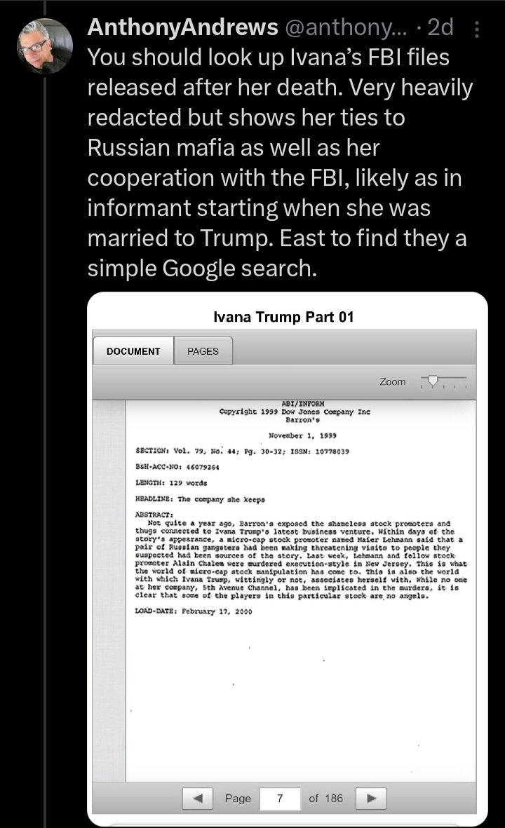 | blomblom @someone44 2025-08-18 Post: Ivana Trump and her ties to Russian gangsters and stocks | | |