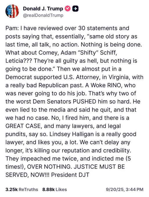 | blomblom @someone44 2025-09-21 Post: adam schiff saved this post of trump reeming out pam bondi because she isnt attacking his enemies quickly enough for him. this is a pathetic show for a president, chasing individuals he wants taken down, illegally using our government | | |